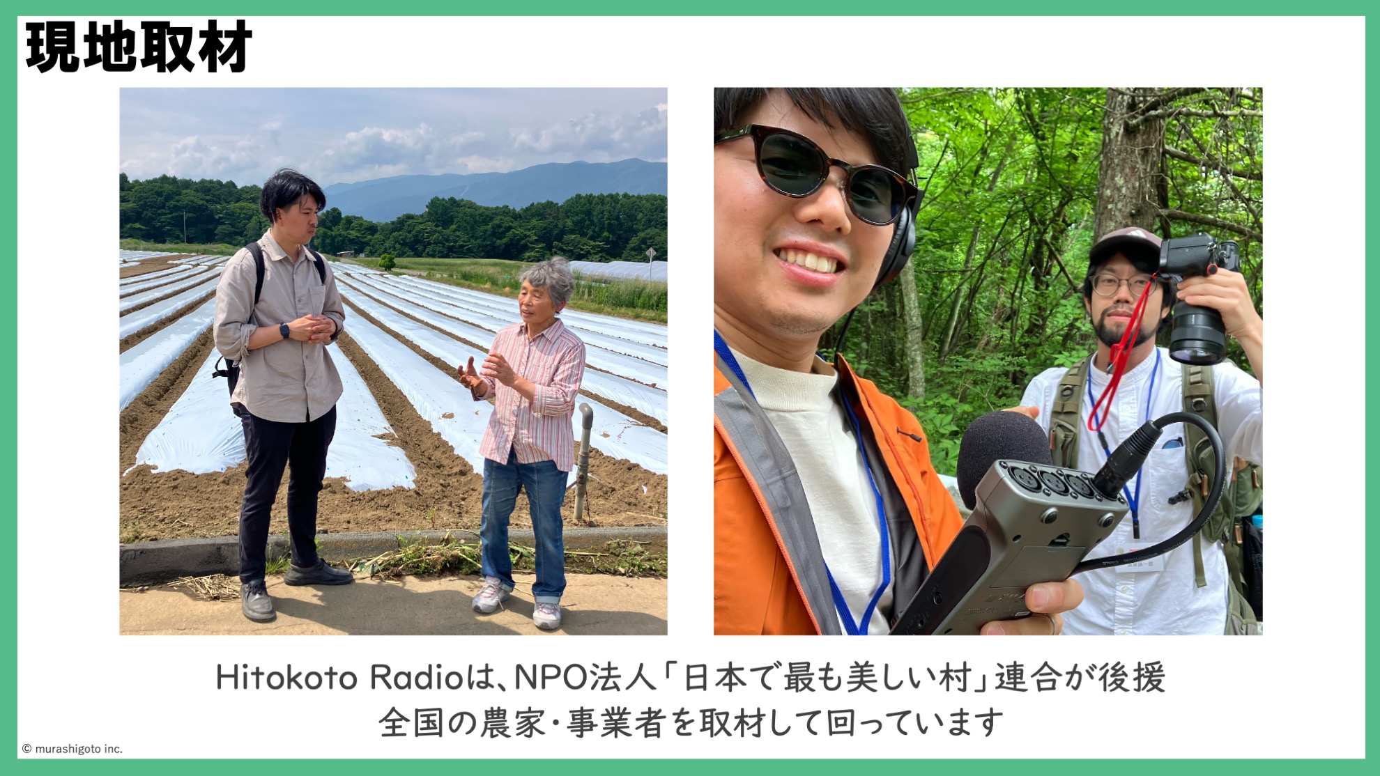 パーソナリティの3人が「日本で最も美しい村」連合アンバサダーとして、全国の自治体・企業との連携促進、食をテーマとしたイベント企画・コンテンツ開発などに取り組んでいます。